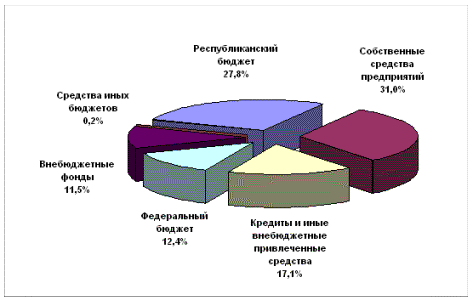 Среди источников финансирования инвестиций ведущее место занимают бюджетные средства: в 2002 г. они составили 40,2% всех вложений в основной капитал. Собственные средства предприятий (прибыль и амортизация) составили 31%.