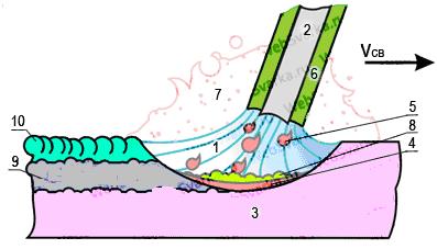 1-сварочная дуга, 2- металлический стержень электрода, 3-основной металл, 4-сварочная ванна, 5-капли жидкого металла, 6-покрытие электрода, 7-газовая защита, 8-жидкая шлаковая ванна, 9-сварочный шов, 10-шлаковая корка.