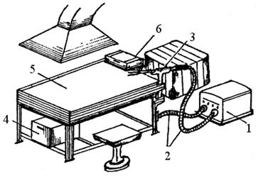 Рис. 3 Постоянный сварочный пост: 1-источник электропитания; 2-кабели; 3-электродержатель; 4-ящик для электродов; 5-стол; 6-ящик для инструментов;