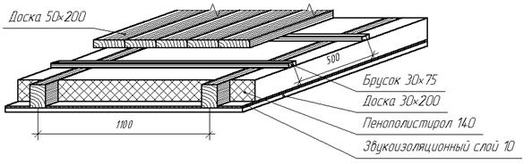По деревянным балкам укладывают щиты наката Рис.4. Балки анкеруются в кирпичную кладку стен. В перекрытии предусмотрена звуко- и теплоизоляция.