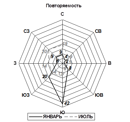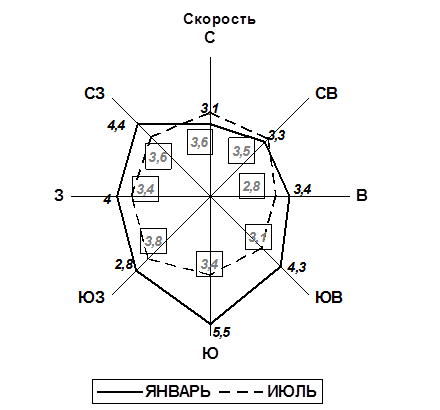 ν- максимальная из средних скоростей ветра по румбам за январь,повторяемость которых составляет 16% и более.