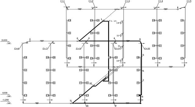 2. Нумеруем стоянки (Ст.1, Ст.2 и т.д.). Вычисляем тепловые нагрузки на стояки системы отопления и выбираем расчётный стояк. Определяем тепловую нагрузку по стоякам и заносим в табл. 3.2.