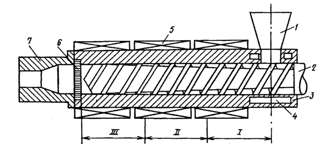 Технологический процесс экструзии складывается из последовательного перемещения материала вращающимся шнеком в его зонах (см. рис. 1): питания (I), пластикации (II), дозирования расплава (III), а затем продвижения расплава в каналах формующей головки.