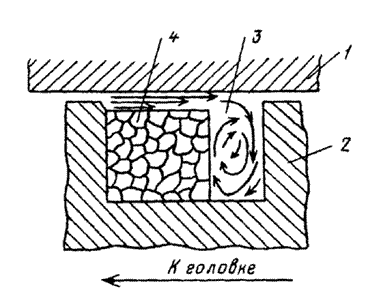 Рис. 2. Схема плавления пробки материала в зоне II в межвитковом сечении шнека: 1- стенки цилиндра; 2- гребень шнека; 3- потоки расплава полимера; 4- спрессованный твердый полимер (пробка) в экструдере.