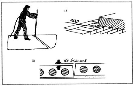 Кручений причальний шнур (рис. 6). Шнур має товщину 1,5–3 мм. Натягують його вздовж стіни, що зводиться. Цей ручний пристрій призначений для дотримання горизонтальності мурування.
