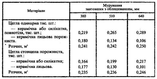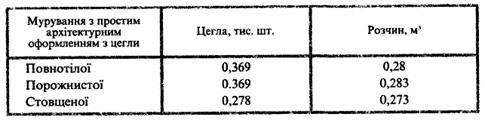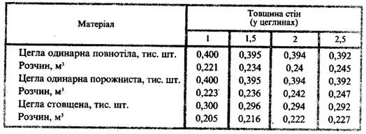Витрати матеріалів на 1 м3 різного за товщиною (у цеглинах) суцільного цегляного мурування зовнішніх і внутрішніх стін з простим архітектурним оформленням із застосуванням повнотілої, порожнистої та стовщеної цегли наведені у таблиці 4.