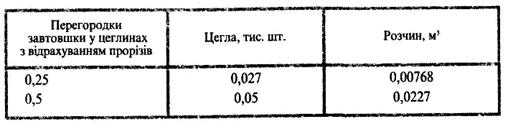 Розраховуємо витрати матеріалів на 25 м3 мурування перегородок з керамічної цегли завтовшки у 0,5 цеглини, використовуючи дані табл. 5: