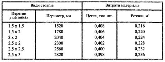 Розраховуємо витрати матеріалів на 40 м3 мурування стовпів завтовшки у 1,5x2 цеглини з повнотілої цегли, використовуючи дані таблиці 7: