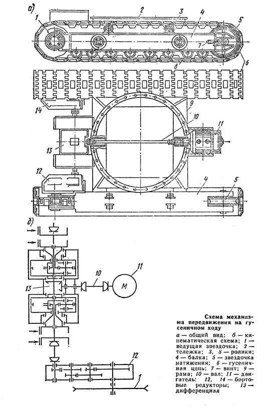 Движитель гусеничного хода машины состоит из двух бесконечных гусеничных цепей (лент) 6, образуемых из шарнирно-связанных между собой отдельных плоских звеньев (пластин, траков). Движение к ведущей звездочке 1 от двигателя 11 передается через карданный вал 10, дифференциал 13, базовые редукторы 12 и 14. Гусеничная цепь охватывает приводную и натяжную звездочки, установленные на концах балок 4, связанных с рамой 9 ходовой тележки. Натяжение ленты достигается перемещением натяжной звездочки в пазах балок с помощью винта 7. Нагрузка от машины передается на нижнюю ветвь гусеничной цепи с помощью опорных роликов 8.