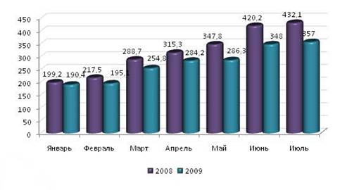 Объем работ по виду деятельности «Строительство» в июле 2009г. остановился на отметке 357 млрд.рублей, что ниже прошлогоднего показателя на 17,8% (Рисунок 1). Несмотря на отрицательные сравнения с успешным 2008 годом – возрастающий тренд все-таки прослеживается с начала 2009 года в соответствии с сезонными тенденциями. Влияние кризиса не оказалось для строителей столь пагубным, как предсказывалось в 2008, однако, размер среднего отставания показателей объемов работ 2009 года в ежемесячном разрезе составил около 13%.