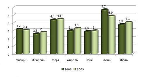 В первом полугодии 2009 было введено 21,6 млн.кв. метров жилья. По причине нехватки финансирования у застройщиков и низкого платежеспособного спроса на новостройки в июне впервые с февраля 2009 года объем ввода в действие жилых домов снизился, причем сразу на 13%. (Рисунок 2.) Резкое снижение случилось в традиционно наиболее результативном для строительной отрасли месяце. Так в июне было построено и введено только 4,9 млн. кв. м жилья, при этом общий показатель с начала года оказался на 0,3% меньше, чем за 1 полугодие 2008 года.