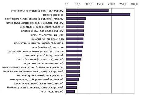 | строительное стекло (в натуральном исчислении), млн.м2 | 3 | 6,6 | 7,8 | 17,4 | 166,7 |