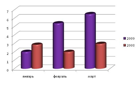 Рисунок 4. Производство оконного стекла в 1 квартале 2008 – 1 квартале 2009 года, млн. кв.м.