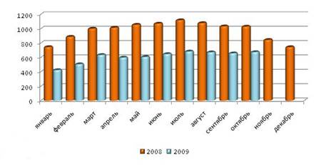 Рисунок 5. Динамика производства строительного кирпича в 2008-2009 гг., млн. усл. кирпичей