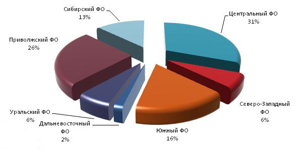 Наибольшие доли в производстве готовой продукции в отрасли на 1 октября 2009 года в денежном выражении, как и в 2008 году, принадлежат Центральному, Приволжскому и Южному федеральному округам (Рисунок 7). При этом лидирующее место по показателю в разрезе областей занимает Краснодарский край (14%), Московская область (13%), Чувашия(6%) и по 5% у Башкортостана и Новосибирской области. Доли остальных регионов в производстве готовой продукции в денежном выражении на 1 октября 2009 года составляют менее 5 процентных пунктов.
