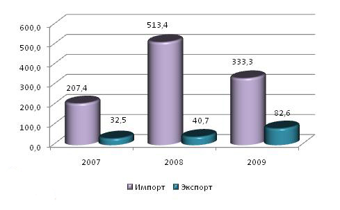 Рисунок 8. Динамика импорта и экспорта строительного кирпича в январе-октябре 2007,2008 и 2009 года, млн. усл. кирпичей