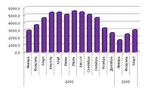 Рисунок 9. Производство цемента в 2008 – 1 квартале 2009 года, тыс тонн