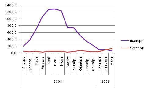 Рисунок 10. Импорт и экспорт цемента в 2008 – 1 квартале 2009 года, тыс.тонн