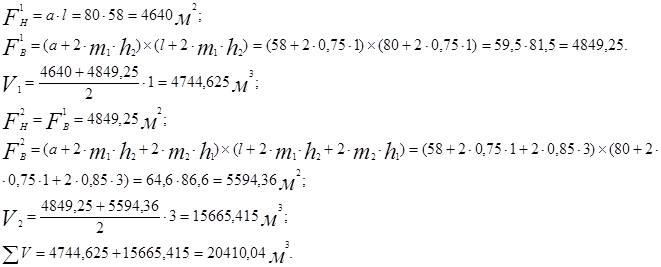 враховуємо величину закладання укоса котлована і користуємося формулою визначення об’єму котлована: