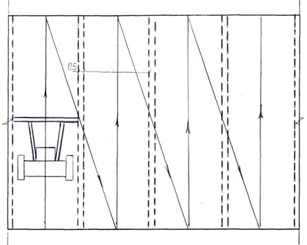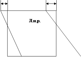 Для визначення червоних позначок вводимо лінію повороту площини перпендикулярно до проектного схилу. Так, як в даному завданні заданий майданчик з нахилом в обидва напрямки від середини – лінії повороту будуть проходити в чвертях довжини майданчика (мал..4).