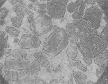 Портландцемент получают путем обжига при высокой температуре (1400-1500°) природного сырья в виде мергелей или искусственной смеси известняка с глиной и другими материалами. Обжиг производится в специальных печах. Обычно цементообжигательная печь - это огромный, длиной 100-150 метров, горизонтально расположенный цилиндр, выложенный внутри огнеупорным кирпичом и медленно вращающийся. Печь устанавливается с наклоном; благодаря этому материалы в ней, пересыпаясь, постепенно передвигаются от одного конца к другому. При обжиге получается спекшийся материал, часть которого расплавилась и застыла в стекловидном состоянии. Этот материал носит название цементного клинкера. На рис. 1 показано строение цементного клинкера при небольшом увеличении. Из рисунка видно, что цементный клинкер состоит из кристаллических минералов, соединенных стекловидным веществом.