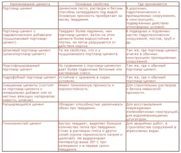 Помимо портландцемента, выпускаются большие количества различных цементов, отличающихся составом сырья, из которого их получают, способом производства и свойствами. Советская цементная промышленность выпускает специальные цементы, предназначенные для особых условий службы бетона и специальных целей. Значительное количество разновидностей цементов получается на основе портландцементного клинкера путем добавки к нему различных веществ. В приведенной таблице 1 дается краткий перечень важнейших цементов с указанием их назначения, особенностей и области применения.