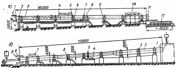 а – размером 5х185 м; 1 – течка для подачи шлама, 2 – фильтр-подогреватель, 3 – цепная завеса, 4 – теплообменники, 5 – бандажи, 6 –подбандажная обечайка, 7 – венцовая шестерня привода барабана печи, 8 – привод печи, 9 – опорные ролики, 10 – орошающая установка, 11 – головка печи, 12 – холодильник;б – размером 3,6х3,3х3,6х150 м; 1 – течка, 2 – цепная завеса, 3 – бандажи, 4 – привод, 5 – венцовая шестерня, 6 – опорный ролик, 7 – орошающая установка, 8 – холодильник, 9 – головка печи.