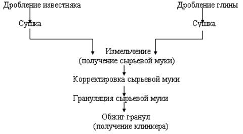 Производство портландцементного клинкера по сухому способу складывается из следующих операций (схема 2):