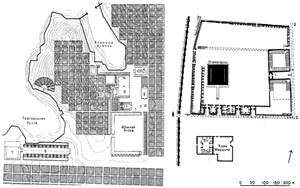 Круглая площадь Южного тетрапила диаметром 43 м также была окружена торговыми помещениями, вероятно, местных купцов. В центре этой площади были расположены четыре раскрепованных столба, фиксировавших главный перекресток города. Ведущую роль в композиции города играло святилище Деметры, в центре которого располагался храм, посвященный этой богине. Внутренний двор святилища по своим размерам (90 х 120 м) уступал святилищу Бэла в Пальмире, но был соразмерен главной площади форума Траяна в Риме. [8]