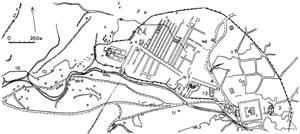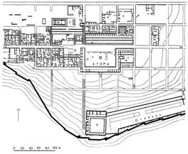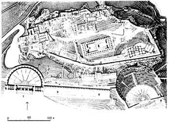 западнее и северо - восточнее центра. Центр Милета развивался вдоль двух пространственных координат, организующих всю планировку города, Вдоль одной из них располагались гимнасий со стадионом и городской парк, вдоль другой — торговые и общественные площади, Эти площади состояли из Южной агоры, предназначенной для торговли, с лавками, расположенными по периметру, и портиками, Южная агора имела три входа, ее размер был 166 Ч 128 м. Северная агора, значительно меньших размеров, предназначалась для торговли предметами роскоши. Между Северной и Южной агорами располагался гражданский центр городской общины. Сюда выходил булевтерий, т. е. здание, где заседал городской совет. Перед булевтерием находился алтарь для принятия присяги гражданами общины. Поблизости располагался еще один гимнасий.