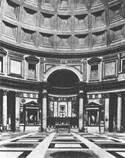 Лучшим произведением этого же периода по праву считается здание Пантеона, возведенное на останках терм Агриппы на Марсовом поле. Огромное пространство Пантеона, перекрытое куполом, являлось не только чудом инженерного искусства того времени, но и определенным этапом развития городских пространств, поскольку это сооружение было соразмерно римским форумам и в нем могло вполне разместиться около 2 тыс. человек. Кроме того, диаметр Пантеона был равен диаметру экседр форумов Августа и Траяна. Эта аналогия подтверждается также и тем, что Пантеон имел верхний просвет диаметром около 9 м, через который проникало солнце и совершало свой круг в течение дня, последовательно освещая отдельные ниши со скульптурным изображением различных богов. Слепые наружные стены Пантеона также походили на стены форумов, лишенные верхних проемов и украшенные лишь карнизными тягами.
