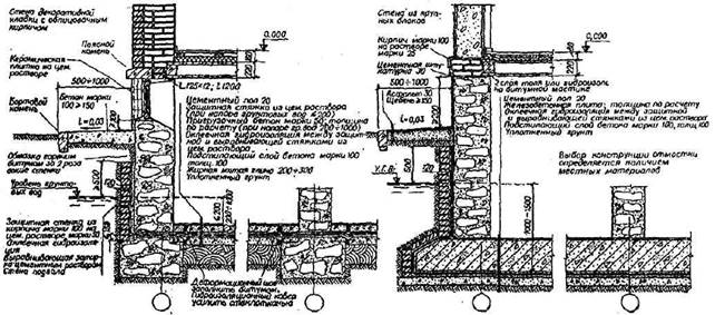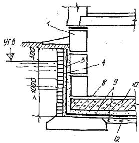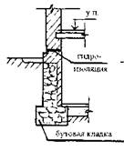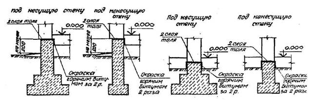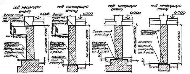 Для защиты стен бесподвальных зданий от капиллярной влаги во всех стенах в цоколе укладывают горизонтальную гидроизоляцию из 2-х слоев толя, рубероида или слоя жирного цементного раствора состава 1:2 толщиной 20-30 мм на 150-200 мм ниже уровня пола первого этажа и на 150 200 мм выше отметки тротуара или отмостки.
