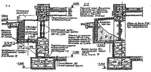 При напорах воды от 0,1 до 0,2 м для защиты подвала от проникновения воды под пол подвала укладывают слой мягкой жирной глины толщиной 250 мм и бетонную подготовку толщиной 100-200 мм. Наружную поверхность стен изолируют штукатуркой цементным раствором с последующей обмазкой горячим битумом за 2 раза и забивкой слоем мягкой жирной глины толщиной 200-250 мм (рис. 26).
