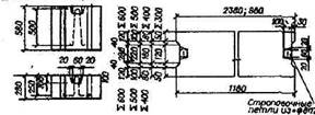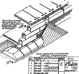 Блоки укладываются с перевязкой швов в шахматном порядке. Длина - 1180 мм; 2380 мм (собачки) дополнительная толщина - 180 мм. Фундаментные блоки со швами с железобетонным раствором, на железобетонных подушках высотою - 300 мм, шириною до 2.80 м (рис. 12).
