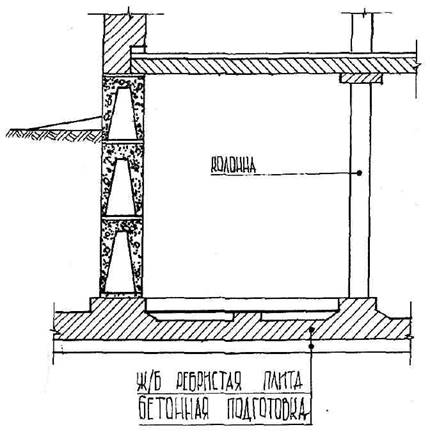 При больших напорах воды, когда уровень грунтовых вод превышает уровень пола подвала более чем на 0,8 м, пол устраивают в виде плоской железобетонной плиты, загруженной стенами дома, или в виде плиты с ребрами верх.