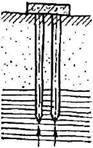 Термический способ укрепления грунта состоит в нагнетании в толщину грунта под давлением через трубы воздуха, нагретого до 600°- 800°С, или в сжигании горючих продуктов, подаваемых в герметически закрытую скважину под давлением. Обожженный грунт приобретает свойства керамического тела, не намокает и не набухает.