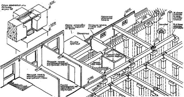 В крупнопанельных зданиях отдельные блоки фундаментов и стен подвалов целесообразно заменять крупноразмерными элементами. Они состоят из сквозных бескаркасных ферм (панелей и блоков или ребристых панелей - подушек).
