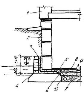 1 – рулонная гидроизоляция; 2 – окрасочная гидроизоляция; 3 – оклеечная гидроизоляция; 4 – защитная стенка из кирпича; 5 – стеклоткань;