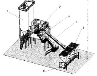 1 – склад цемента; 2 – бетоносмеситель;3 – блок дозаторов;4 – наклонный конвейер;5 – расходные бункера для инертных материалов заполнителей (песок, щебень);6 – дозатор – конвейер инертных материалов заполнителей (песок, щебень)
