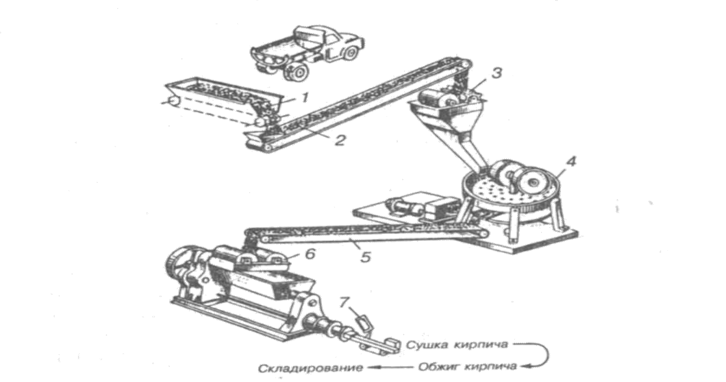1- ящичный подаватель; 2, 5- конвейер; 3- дробление глины; 4- помол глины на бегунах; 6- формование кирпича на ленточном прессе; 7- резка кирпича- сырца на автомате.