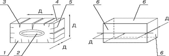 6- прессующая головка; 7- мундштук; 8- глиняный брус. Д – направления действия усадочных деформирующих сил. 1 – кирпич сырец; 2- ядро