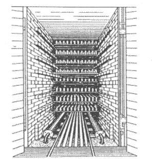 Обжиг является завершающей стадией технологического процесса производства керамических изделий, имеющего целью закрепить форму изделия и придать ему необходимые физико-механические свойства. Печи для обжига кирпича строительного применяют двух типов: периодического (туннельного) и непрерывного действия. В печах первого типа (Приложение 2, рис. 5) весь процесс обжига происходит последовательно во времени и в каждый момент в рабочей камере печи происходит только одна какая-нибудь стадия процесса обжига (загрузка, нагрев, охлаждение, выгрузка). В печах непрерывного действия процесс обжига протекает непрерывно, при этом в разных частях печи одновременно происходят различные стадии процесса.