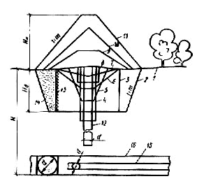 Для осушения больших строительных площадок, на которых разрабатывается грунт и устраиваются выемки для строительства подземной части здания или сооружения, эффективен способ, основанный на использовании открытых водопонизительных скважин-колодцев, оснащенных насосами. По периметру будущей выемки устраивают скважины диаметром до 400 мм и погружают в них фильтровые колонны. Фильтровая колонна состоит из обсадной трубы с фильтром отстойника, водоподъемной трубы; по верху вокруг фильтровой колонны устраивают грунтовую обсыпку высотой 0,2-0,3 м (рис.6). Внутрь фильтровой колонны опускают насос, производительность которого определяется параметрами, характеризующим приток грунтовых вод. Приводной двигатель насоса может находиться как внутри скважины, так и над ее устьем. В первом случае он имеет водонепроницаемое исполнение и работает в затопленном состоянии, во втором - соединяется с насосом длинным трансмиссионным валом.
