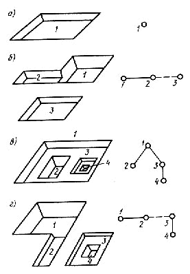Для формализованного описания пространственной формы можно использовать графы (см. рис.2). Вершина графа представляет собой какую-либо часть земляного сооружения, а ребра 1-2, 2-3, 3-4 показывают взаимосвязь этих частей в его общей конструкции. Формализацию такого вида целесообразно применять, когда организационно-технологические расчеты, связанные с подготовкой производства земляных работ на объекте, могут быть решены с использованием ЭВМ.