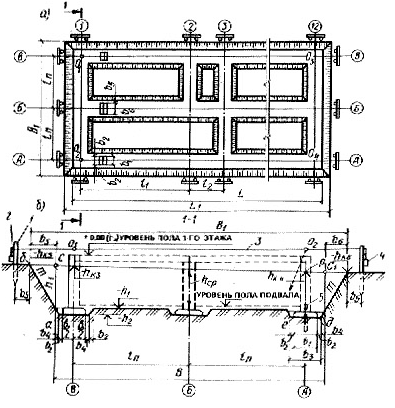 Вертикальные отметки в строящемся здании определяют относительно отметки ±0,00, которая соответствует уровню пола 1-го этажа (рис.3, б). Все отметки, расположенные выше, берут со знаком "+", а ниже - со знаком " -".