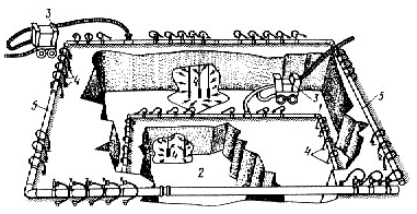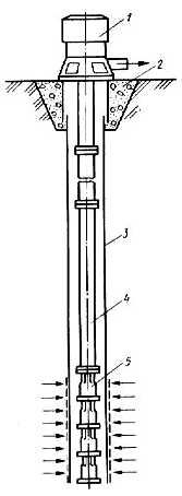 1 - привод насоса; 2 - обсыпка; 3 - фильтровая колонна; 4 - водоподъемная труба; 5 - насос