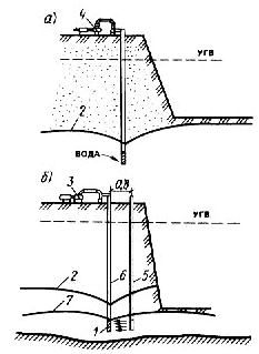 Применяют также открытые самоизливающиеся скважины. Изливающуюся из устья воду отводят к водосборникам и откачивают насосами. Скважины могут иметь различный наклон. Вертикальные скважины служат для снятия избыточного напора в нижележащих водоносных слоях грунта. Горизонтальные могут устраиваться в откосах выемок.