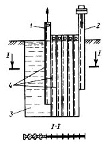 Для повышения эффективности работы иглофильтровых установок в глинистых грунтах с невысокими коэффициентами фильтрации (менее 0,1 м/сут) используют способ электроосмоса - перемещение воды в грунт под влиянием пропускаемого через него постоянного тока. В этом случае в грунт рядом с иглофильтрами на расстоянии до 1 м погружают стальные трубы или стержни из арматурной стали (рис.5, б), которые подключают в цепь к положительному полюсу источника постоянного тока с напряжением 30-60 В. По воздействием электрического тока вода, содержащаяся в порах грунта, освобождается и перемещается в сторону иглофильтра. В результате водоотдача грунта повышается более чем в 5 раз.