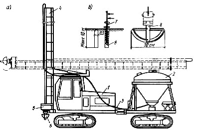а - общий вид установки; б - схема устройства скважин; 1 - базовый трактор; 2 - емкость с цементом; 3 - рукав для подачи цемента; 4 - рама бура; 5 - привод вращения бура; 6 - бур; 7 - полый вал бура; 8 - отверстие для подачи цемента; 9 - цементно-грунтовая свая