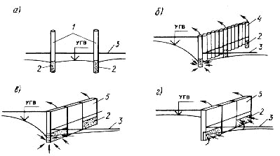 а - отдельно стоящие сваи-опоры; б - стена из дренирующих свай; в - двухсторонняя дренирующая стена: г - односторонняя дренирующая стена: 1 - сваи-опоры; 2 - фильтр-бетон: 3 - дно котлована; 4 - сваи, 5 - стена
